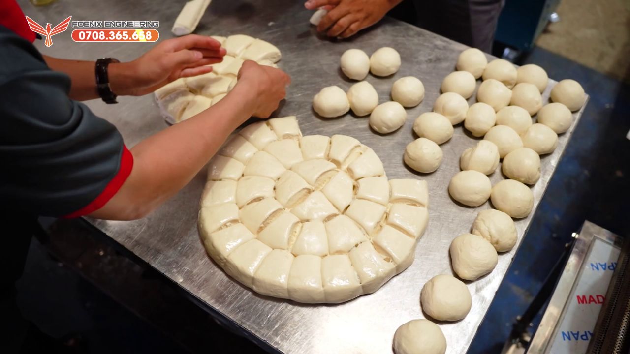 Sau khi trộn bột và chia vo xong, anh em sẽ bắt đầu vê tạo hình với máy se bánh mì FOENIX.