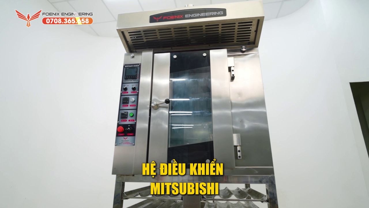 Lò nướng xoay mini FOENIX sử dụng động cơ motor chính hãng Toshiba đạt tiêu chuẩn IE2 toàn cầu, hệ điều khiển Mitsubishi, đèn halogen sáng chuẩn giúp canh màu bánh dễ dàng.
